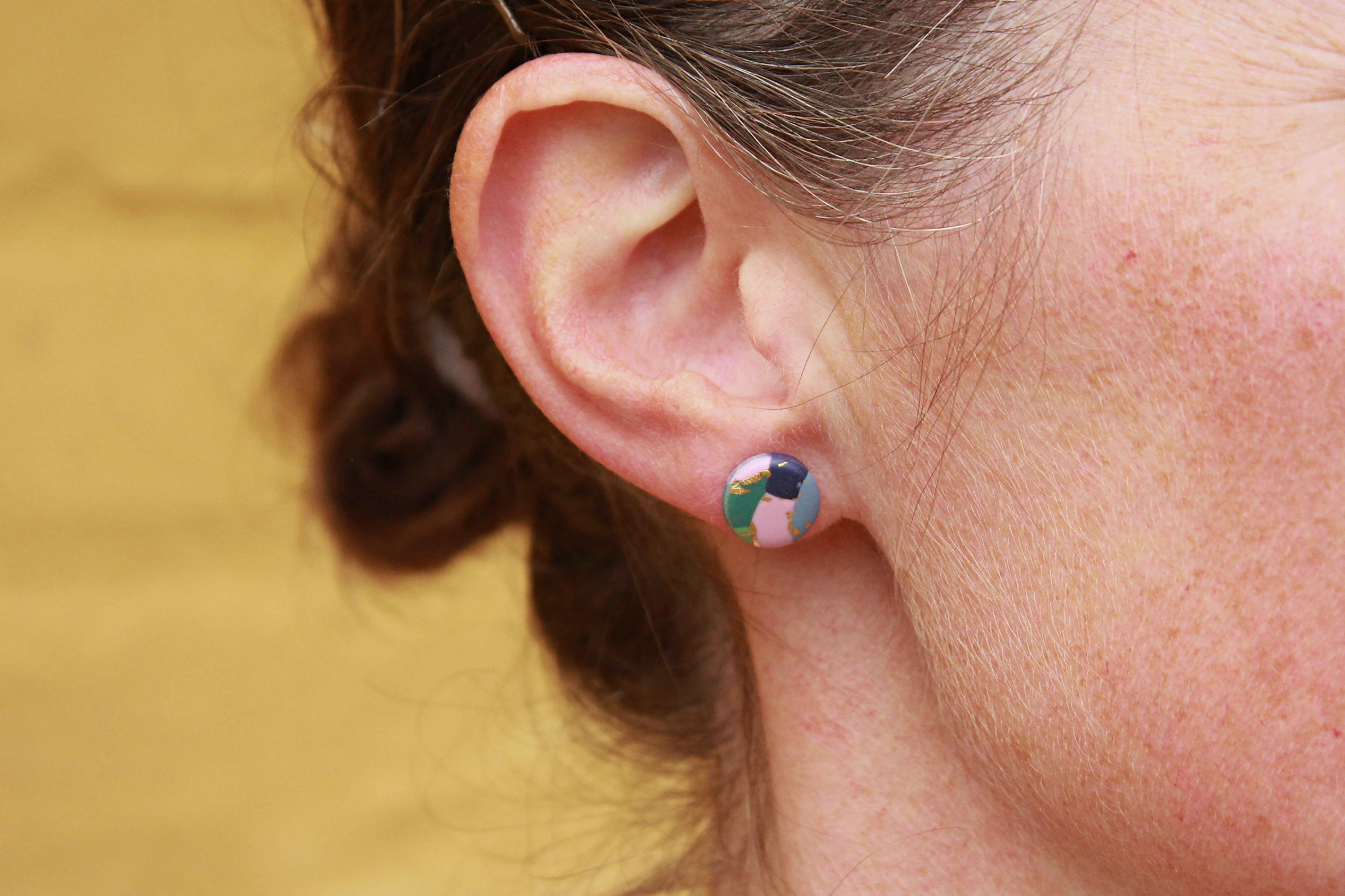 Lavet i farverne midnatsblå, rosa, gråblå, mørk grøn og lys grøn - kombineret med guldmetal. Øreringen er lakeret.
