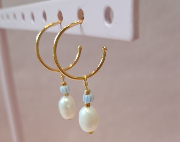 6) Åben creol - 1 stk. - i forgyld sterlingsølv, med ferskvandsperle samt perler i guld og blå.