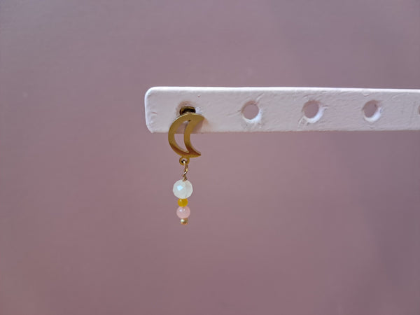 3) Måne ørestik - 1 stk. - i forgyldt stål, med perler i rosa og gul.