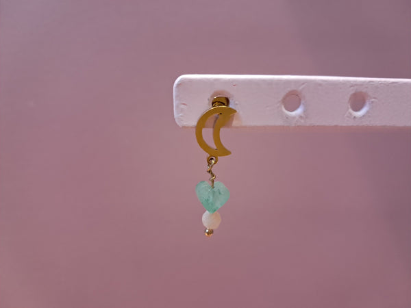 4) Måne ørestik - 1 stk. - i forgyldt stål, med rosa glasperle og grønt hjerte i glas.